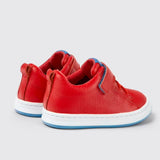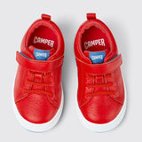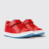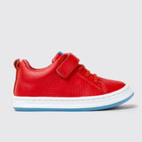 Red leather kids' sneakers with a hook-and-loop closing system, OrthoLite® Recycled™ removable footbeds, and rubber outsoles.