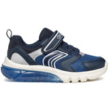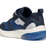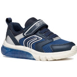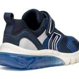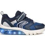 Flexy breathable junior sneaker with lights built into the sole. This attractive navy-blue and dark-silver version of Ciberdron will stand them in excellent stead for days at school and playtime afternoons. Crafted from fabric and a tumbled-leather-effect material, it is bound to impress with its dynamic design and sporty overtones.