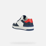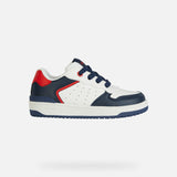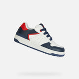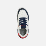 Low-cut junior sneaker with a casual contemporary aesthetic that takes its cues from a basketball shoe. This white-&-navy blue version of Washiba is not only comfortable and breathable, but will also be an easy match to city styling. It has been crafted from a leather-effect material and fabric, and will lift any outfit with an on-trend twist, whether it is for schooltime or afternoons at the park.