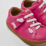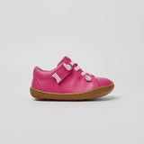 Pink full-grain leather kids’ shoe with stitched outsole and Pink Laces.