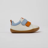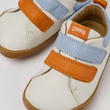 White, blue, and orange leather kids' shoes with stitched rubber outsoles (20% recycled) and hook-and-loop closing system.