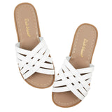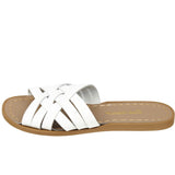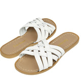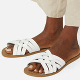 Introducing the Retro Slide in Salt-Water White leather. We have updated the classic Retro from the 1970s back catalogues into a modern slider sandal. It has the same beautiful woven basket upper, 100% waterproof leather and vulcanised rubber hand stitched sole but without the ankle strap. Perfect for sliding on and off, this summer sandal is your ultimate poolside partner.