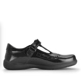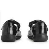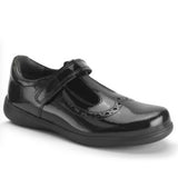 For girls looking for a shiny new pair of school shoes, look no further! Featuring a patent upper and new star punch detailing, our Hope primary school shoe offers great all-day comfort with padded ankles, breathable leather and textile linings, removable footbed, and a biomechanically engineered rubber sole. The t-bar rip-tape fastening is easy to adjust for a just-right fit and keeps shoes securely in place, while making getting ready fast and fuss-free.
