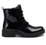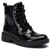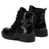 Geox Casey patent boot with lace up fastening and zip at the side. Star print design on the heel.