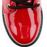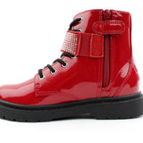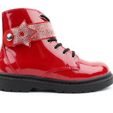 Girls Military Style Ankle Boots from Lelli kelly.  These Girls Boots have a soft rich red patent upper with silver glitter band with star shape with a button closure.  Leather insoles for all daty comfort, lace and zip for easy on & off.