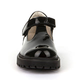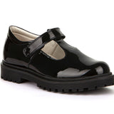 Froddo black patent t-bar shoe with velcro fastening and chunky soles.