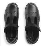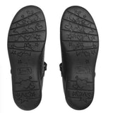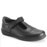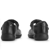 Style, comfort and protection unite with our Hope black dyed through leather primary school girls shoes. With gorgeous star punch detailing, this pair provides ultimate comfort with breathable leather and textile linings, removable insoles, and padded collars. Rushing from classroom to playground is made safe and easy in this dependable pair of school shoes as the rubber sole has been biomechanically engineered to flex and move seamlessly on all surfaces. The t-bar rip-tape fastening offers great adjustability and keeps shoes snug to active feet as they navigate their day.