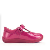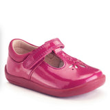 These red patent T-bar shoes are designed to support first steps in style. Padded ankles and a lightweight, flexible sole will support little feet as they move and play, encouraging natural movement. Cushioned insoles and leather linings help to keep feet comfortable all day and there's an easy on/off rip-tape fastening to keep a snug fit.