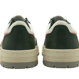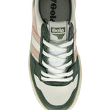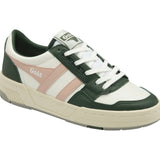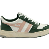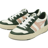 Challenge follows the trainer trend for deeper sole units and ‘80s referenced light grey outsoles with a vintage tennis twist. Gola takes the look up a level with eye catching colour combinations; a crisp white leather upper is complemented with evergreen and pearl pink contrasting panels to give a feminine take on the look. This fashion forward women’s laced, low top Gola trainer will look equally at home with your favourite denim or styled for a relaxed day at the office.